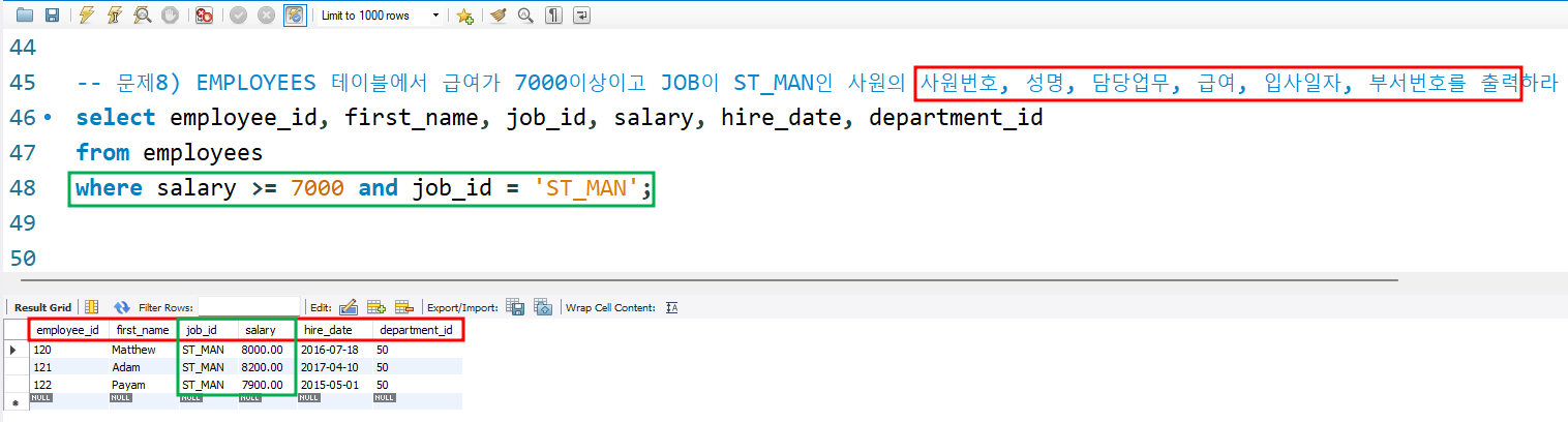 -- 문제8) EMPLOYEES 테이블에서 급여가 7000이상이고 JOB이 ST_MAN인 사원의 사원번호, 성명, 담당업무, 급여, 입사일자, 부서번호를 출력하라.
