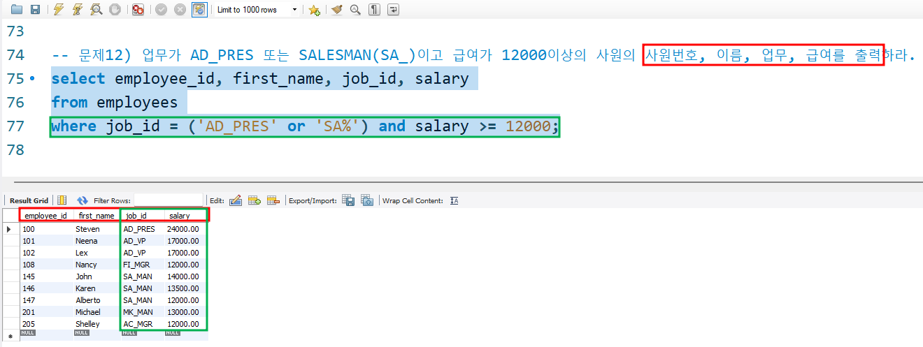 -- 문제12) 업무가 AD_PRES 또는 SALESMAN(SA_)이고 급여가 12000이상의 사원의 사원번호, 이름, 업무, 급여를 출력하라.