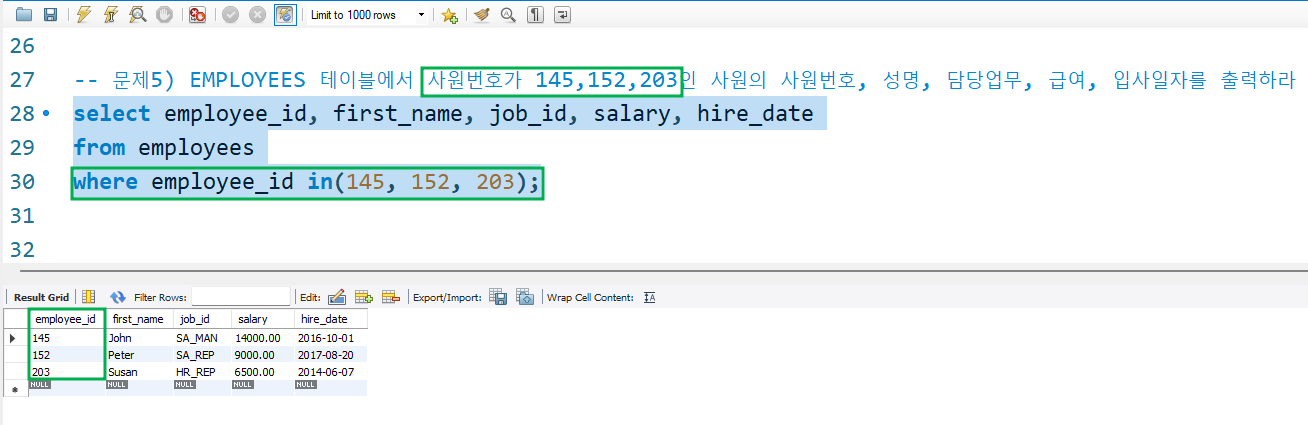 -- 문제5) EMPLOYEES 테이블에서 사원번호가 145,152,203인 사원의 사원번호, 성명, 담당업무, 급여, 입사일자를 출력하라.