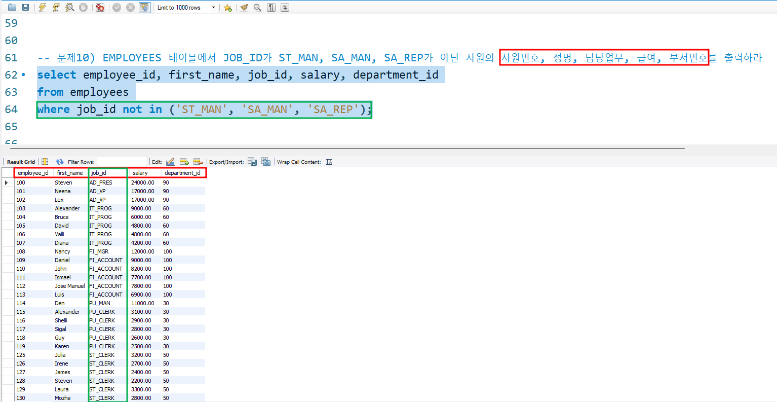 -- 문제10) EMPLOYEES 테이블에서 JOB_ID가 ST_MAN, SA_MAN, SA_REP가 아닌 사원의 사원번호, 성명, 담당업무, 급여, 부서번호를 출력하라