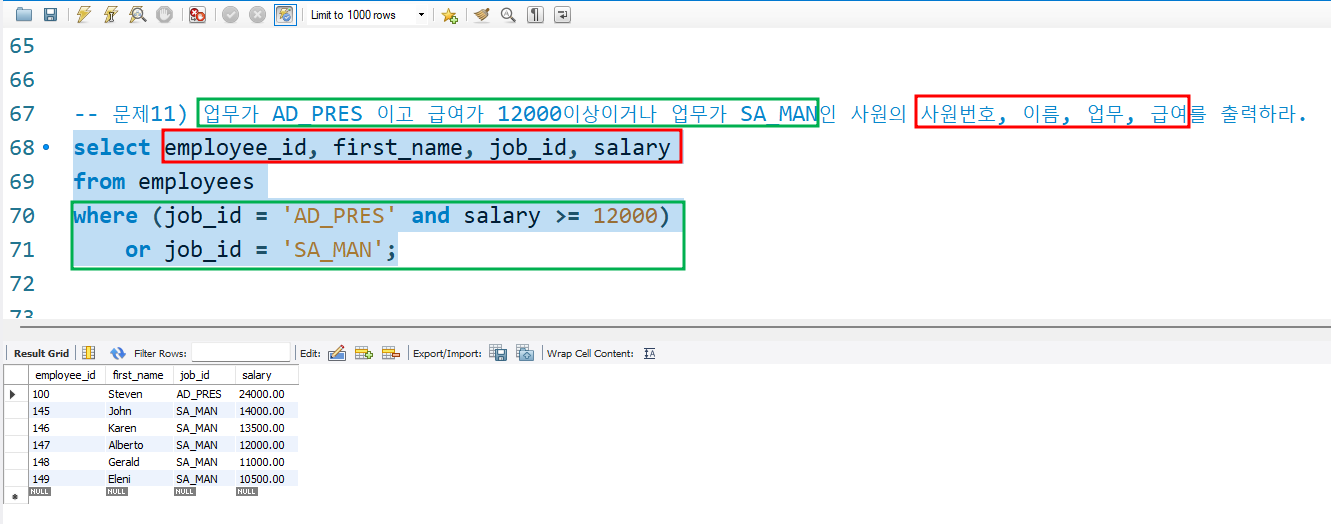 -- 문제11) 업무가 AD_PRES 이고 급여가 12000이상이거나 업무가 SA_MAN인 사원의 사원번호, 이름, 업무, 급여를 출력하라.