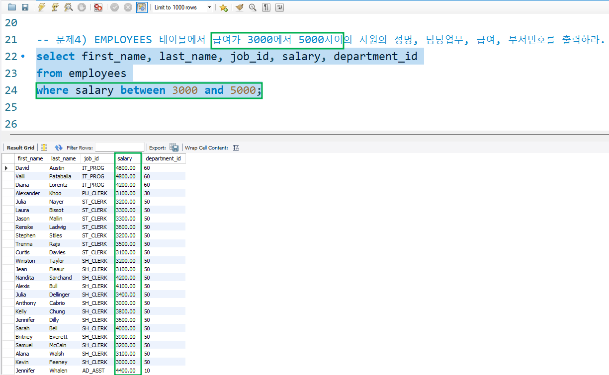 -- 문제4) EMPLOYEES 테이블에서 급여가 3000에서 5000사이의 사원의 성명, 담당업무, 급여, 부서번호를 출력하라.