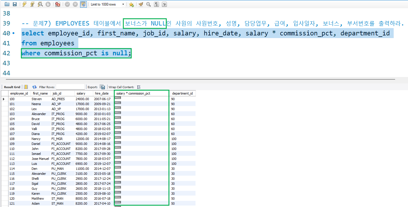 -- 문제7) EMPLOYEES 테이블에서 보너스가 NULL인 사원의 사원번호, 성명, 담당업무, 급여, 입사일자, 보너스, 부서번호를 출력하라.