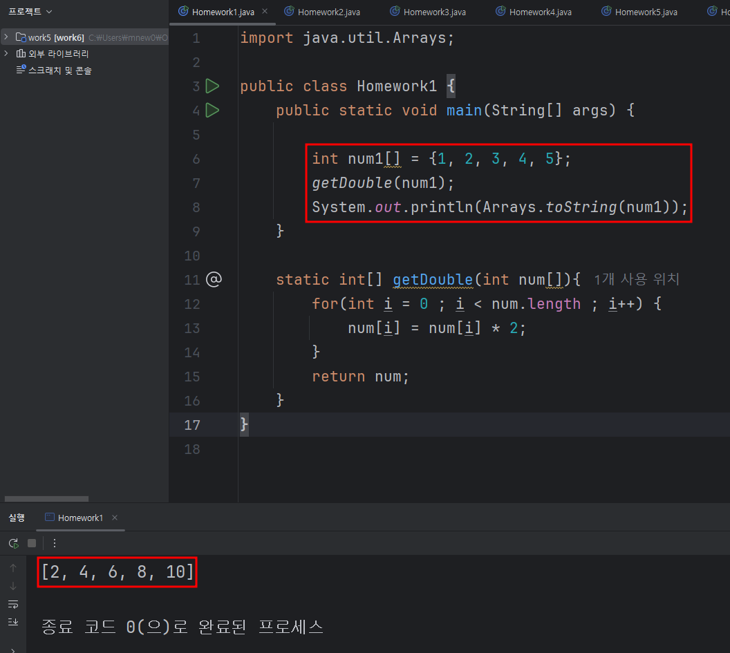 1번. 배열의 값에 각 2배의 연산된 값이 산출되도록 메소드를 작성하시오.int num1[] = {1, 2, 3, 4, 5}; // num1 = getDouble(num1); getDouble(num1); System.out.println(Arrays.toString(num1)); 1번 문제 풀이import java.util.Arrays;public class Homework1 { public static void main(String[] args) { int num1[] = {1, 2, 3, 4, 5}; getDouble(num1); System.out.println(Arrays.toString(num1)); } static int[] getDoub..