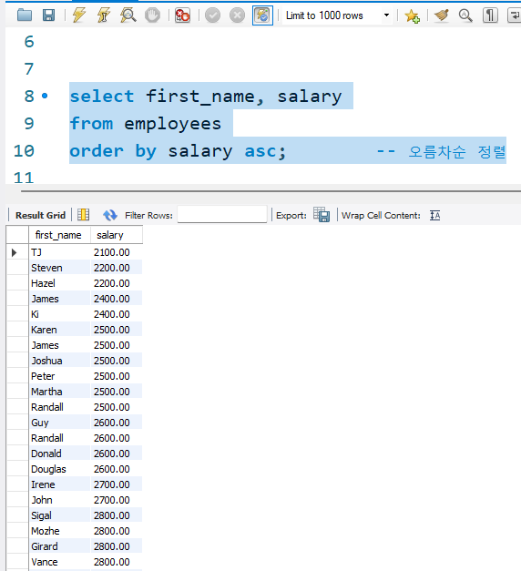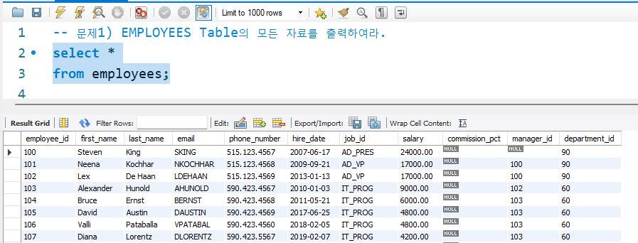 -- 문제1) EMPLOYEES 테이블에서 급여가 6000이상인 사원의 사원번호, 이름, 담당업무, 급여를 출력하라.select employee_id, first_name, job_id, salaryfrom employeeswhere salary >= 6000;-- 문제2) EMPLOYEES 테이블에서 담당 업무가 ST_MAN인 사원의 사원번호, 성명, 담당업무, 급여, 부서번호를 출력하라.select employee_id, first_name, job_id, salary, department_idfrom employeeswhere job_id = 'ST_MAN'; -- 문제3) EMPLOYEES 테이블에서 입사일자가 2019년 1월 1일 이후에 입사한 사원의 사원번호, 성명, 담당업무, 급여, 입사일자..